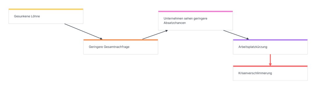 Die Gesamtnachfrage blieb also gering. Die Unternehmen würden durch die niedrige Gesamtnachfrage weiter geringere Absatzchancen in ihren Waren sehen und weiter Arbeitsplätze kürzen, wodurch sich die Krise verschlimmert.